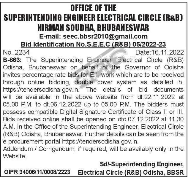 Tender for The Superintending Engineer, Electrical Circle (R&B) Odisha, Bhubaneswar on behalf of the Governor of Odisha invites percentage rate bids for E.I. work which are to be received through online bidding, double cover system