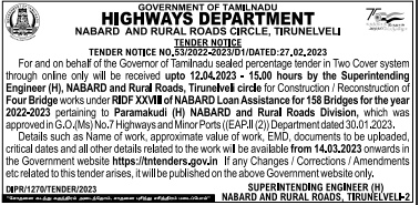 Tender for the Superintending Engineer (H), NABARD and Rural Roads, Tirunelveli circle for Construction/Reconstruction of Four Bridge works under RIDF XXVII of NABARD Loan Assistance for 158 Bridges for the year 2022-2023 pertaining to Paramakudi (H) NABARD and Rural Roads Division,