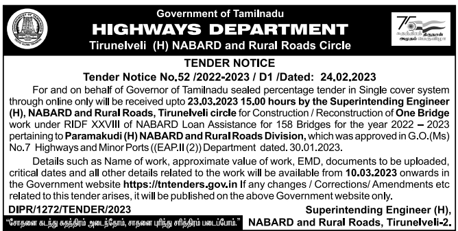 tender for the Superintending Engineer (H), NABARD and Rural Roads, Tirunelveli circle for Construction/Reconstruction of One Bridge work under RIDF XXVIII of NABARD Loan Assistance for 158 Bridges for the year 2022 – 2023 pertaining to Paramakudi (H) NABARD and Rural Roads Division, which was approved in G.O.(Ms) No.7 Highways and Minor Ports ((EAP.II (2)) Department dated. 30.01.2023.
