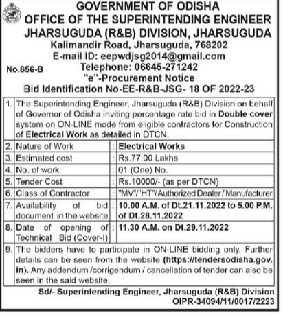 Tender for The Superintending Engineer, Jharsuguda (R&B) Division on behalf of Governor of Odisha inviting percentage rate bid in Double cover system on ON-LINE mode from eligible contractors for Construction of Electrical Work as detailed in DTCN.