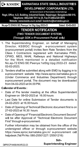 Tender for The Superintending Engineer, on behalf of Managing Director, KSSIDC through e-procurement system (e-procurement portal) invites Item Rate Tenders from the Class Contractors registered with Karnataka PWD, CPWD, MES, NHAI, Railways and National Highways