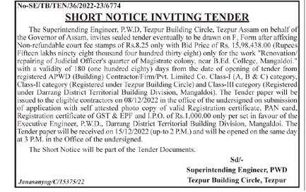 Tender for The Superintending Engineer. P.W.D. Tezpur Building Circle, Tezpur Assam on behalf of the Governor of Assam, invites sealed tender eventually to be drawn on F, Form after affixing