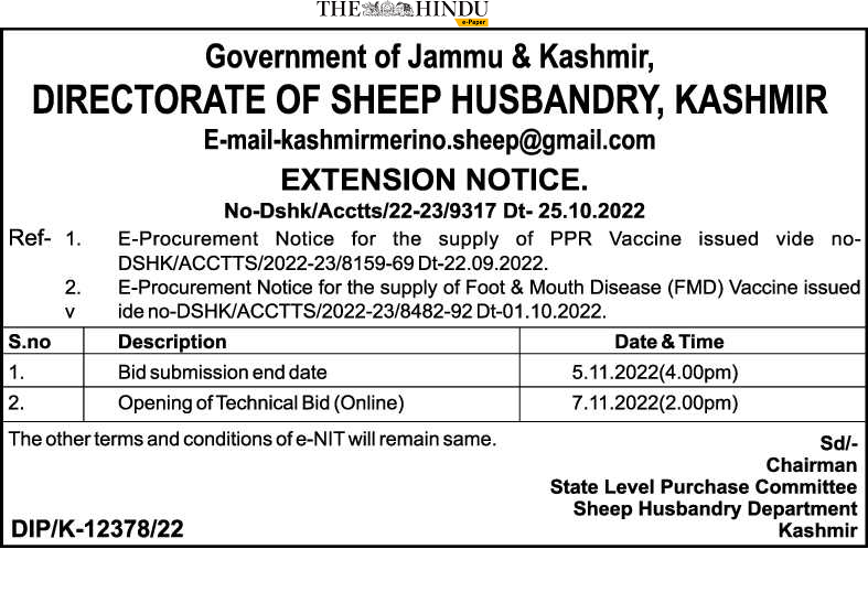 E-Procurement Notice for the supply of Foot & Mouth Disease (FMD) Vaccine issued ide no-DSHK/ACCTTS/2022-23/8482-92 Dt-01.10.2022.