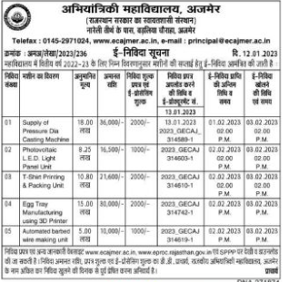 Tender for the supply of machines as per the following details for the financial year 2022-23 in the college.