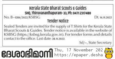 Tender for the supply of T Shirts for the Kerala State Bharat Scouts & Guides.