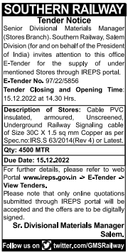 E-Tender for the supply of under mentioned Stores through IREPS portal.Description of Stores: Cable PVC insulated, armoured, Unscreened, Underground Railway Signaling cable of Size 30C X 1.5 sq mm Copper as per Spec.no:IRS.S 63/2014(Rev 4) or Latest.