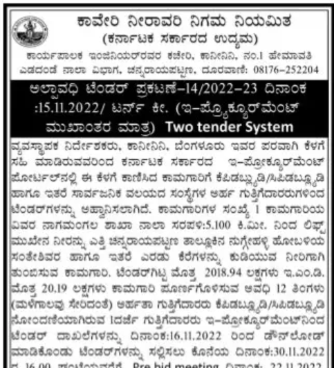 Tender for The undersigned, on behalf of the Managing Director, Kaninini, Bangalore, invites tenders from eligible contractors of KPWD, CPWD and other Public Sector Undertakings for the work mentioned below on the e-procurement portal of the Government of Karnataka. Number of Works | of work Details Nagamangala Branch Canal Chain: 5.100 km. The work of lifting water from lift and filling Santeshivara and other two lakes of Nuggehalli hobli of Channarayapatna taluk for drinking water