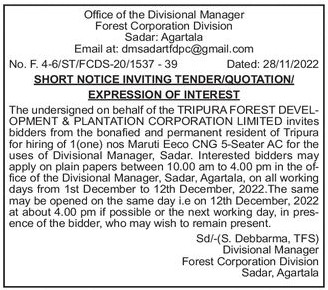 Tender for the uses of Divisional Manager, Sadar. Interested bidders may apply on plain papers between 10.00 am to 4.00 pm in the of fice of the Divisional Manager, Sadar, Agartala, on all working days