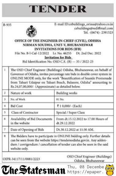 Tender for Odisha, Bhubaneswar, on behalf of Governor of Odisha, invites percentage rate bids in double cover system in ONLINE MODE only, for the work Beautification of Seaside Promenade from Talsari Udaipur on Talsari Beach, Balasore, Odisha amounting to Rs.24,07,00,000/- (Approximate) as detailed below.
