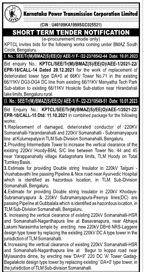 Tender for the work of replacement of deteriorated tower type DA+0 at 66KV Tower No.71 in the existing 66/11KV DG3-DG4 DC line from existing 66/11KV Manyatha Tech Park Sub-station to existing 66/11KV Hoskote Sub-station near Hirandahali lake limits, Bengaluru rural.