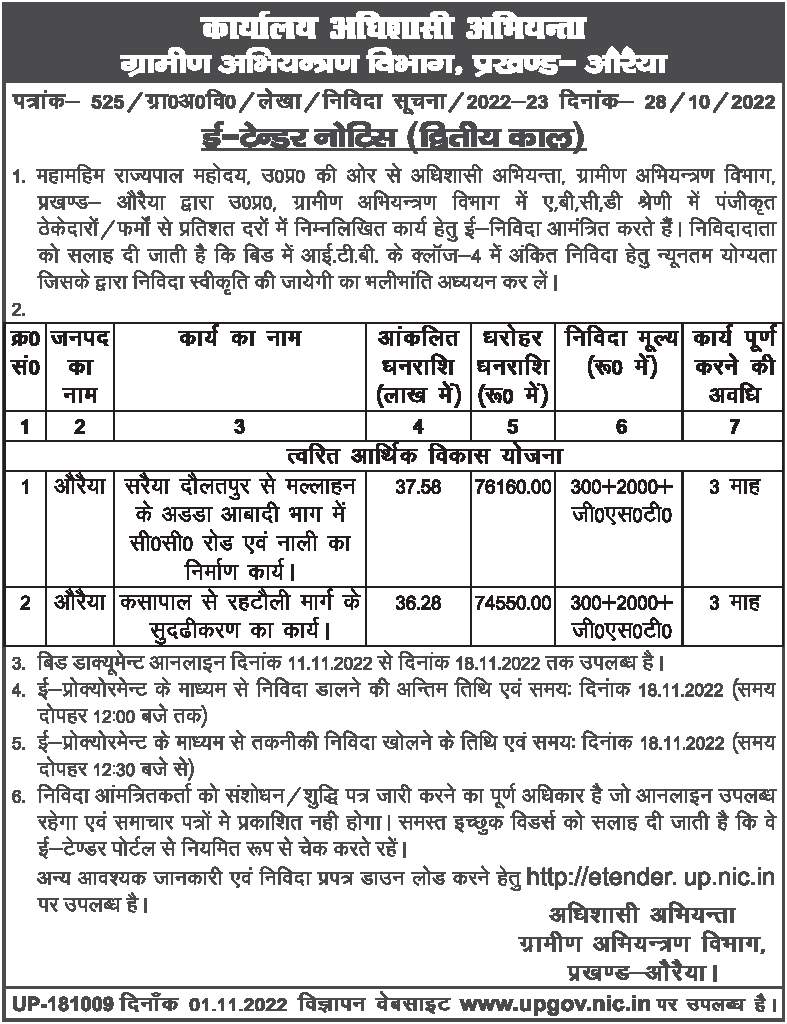 Tender for The work of strengthening the Kasapal to Rahatauli road.