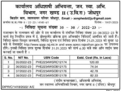 Tender for the work of tender number 35-38/2022-23 Office of the Superintending Engineer, Jan. Swa. Abhi. Department, Municipal Section II ( U. V. R.) Jodhpur