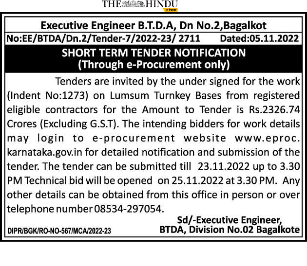 Tenders are invited by the under signed for the work (Indent No:1273) on Lumsum Turnkey Bases from registered eligible contractors for the Amount to Tender is Rs.2326.74 Crores (Excluding G.S.T). The intending bidders for work details may login to e-procurement website www.eproc. karnataka.gov.in for detailed notification and submission of the tender.