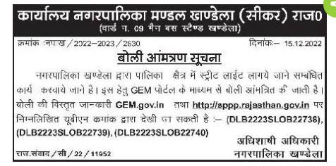 Tender for The work related to the installation of street lights in the municipal area is to be done by Khandela Municipality. For this, bids are invited through GEM portal. The details of the choli can be viewed on GEM.gov.in