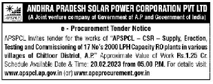 Tender for the works of APSPCL – CSR Supply, Erection, Testing and Commissioning of 17 No’s 2000 LPH Capacity RO plants in various villages of Chittoor District,
