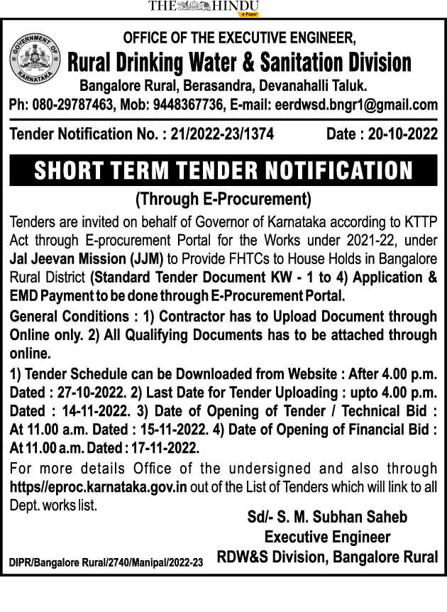 Tender for the Works under 2021-22, under Jal Jeevan Mission (JJM) to Provide FHTCs to House Holds in Bangalore