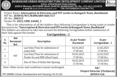Tender for This is for information of all the bidders that following Corrigendum is being made in tender documents for Interception & Diversion and STP works in Ramgarh Town, Jharkhand.