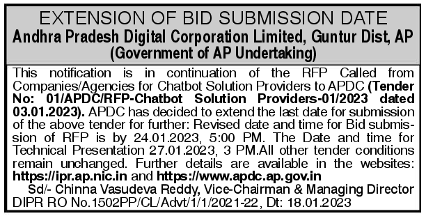 Tender for This notification is in continuation of the RFP Called from Companies/Agencies for Chatbot Solution Providers to APDC