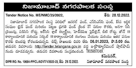 Tender For 27 works under Nizamabad Municipal Corporation under General Fund, SCSP Fund, 15th Finance Commission Tide Fund and Urban Development Fund viz CC Drains, VDCC Road, RCS Slab Culvert, HPE Pipeline, BT Road, Painting of Zone III Office and Circle III