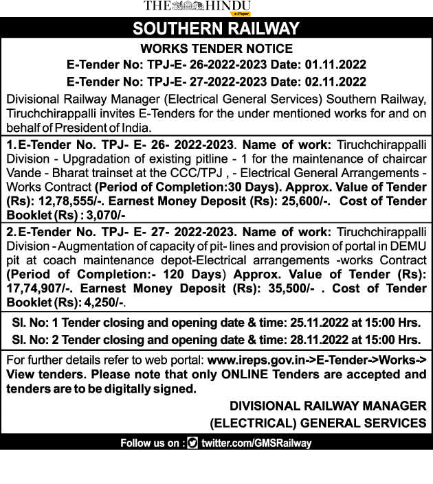 Tender for Tiruchchirappalli Division – Augmentation of capacity of pit- lines and provision of portal in DEMU