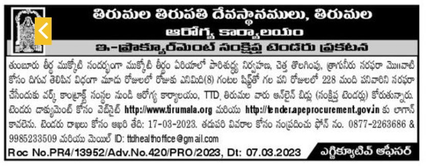 Health Office, TTD, to supply 228 laborers from work contract firms for three days with eight (8) hour shifts per day as mentioned below for sanitation maintenance, garbage removal, drinking water supply etc. in the Mukkoti Theertham area on the occasion of Tumburu Tirtha Mukkoti. Tirumala is seeking online bids (abbreviated tenders). Login to website http://www.tirumala.org and http://lender.apeprocurement.gov.in for tender document. Last date for submission of tender: 17-03-2023.