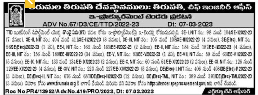 E-ProcurementP e-tenders are invited for ninety seven (97) works of TTD Engineering Department. SE-I, NIT NO. 98 to 104.SE 12022-23 |