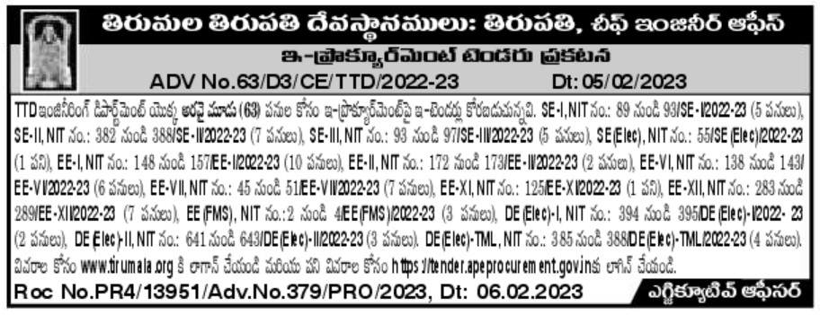 E-tenders are invited on e-procurement for sixty three (63) works of TTD Engineering Department. SE-I, NIT No.: 89 to 93/SE-I2022-23 (5 Works), SE-