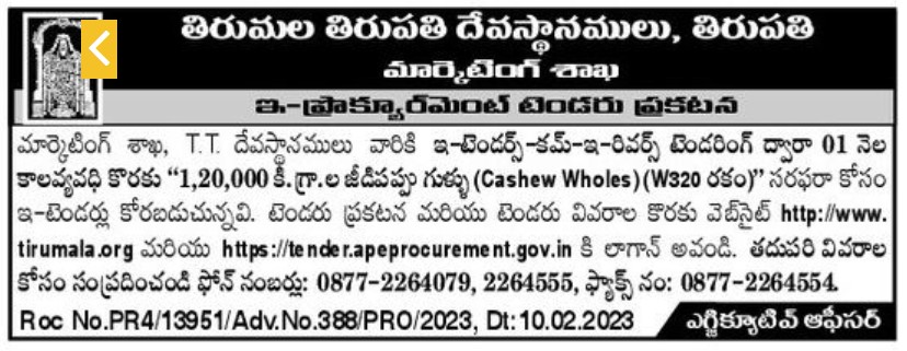 Tender for Tirumala Tirupati Devasthanams, Tirupati Marketing Department E-Procurement Tender Announcement