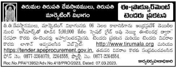 E-tenders are invited for the supply of 5,00,000 kg special grade cow ghee with agmark from Andhra Pradesh dairies for a period of 06 months to T.T. Devasthanamul, Marketing Department through e-tenders.