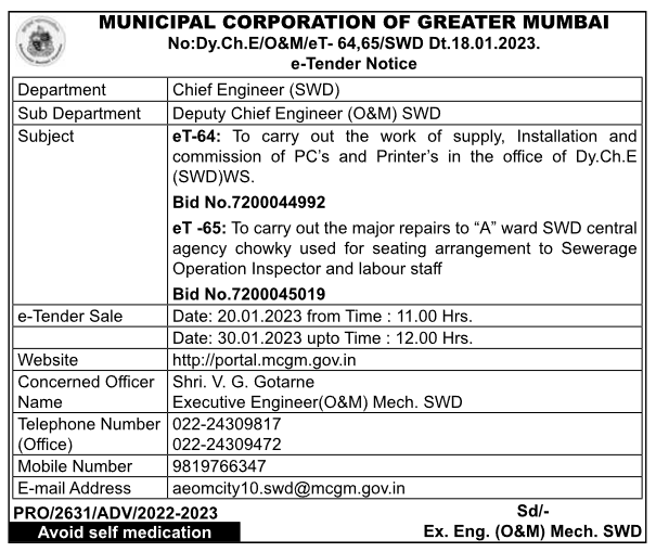 Tender for To carry out the major repairs to “A” ward SWD central agency chowky used for seating arrangement to Sewerage Operation Inspector and labour staff