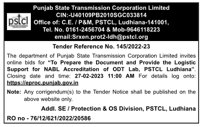 Tender for To Prepare the Document and Provide the Logistic Support for NABL Accreditation of ODT Lab, PSTCL Ludhiana.