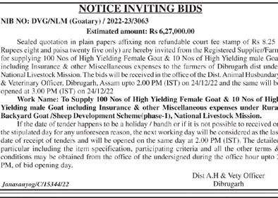 Tender for To Supply 100 Nos of High Yielding Female Goat & 10 Nos of High Yielding male Goat including Insurance & other Miscellaneous expenses under Rura Backyard Goat/Sheep Development Scheme phase-1), National Livestock Mission.