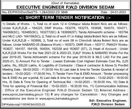 Tender for Total no of work 12 in Chittapur taluka Indent No’s are as follows: Under K.K.R.D.B 164225, DMF Works- 163276, 163275, 163698, 164070, 164071, 164068(SC), 163485(SC), 163277(SC) & 163699(ST) Tanda Abhiveridhi scheme – 163794 and MLC LAD- 164159(SC).