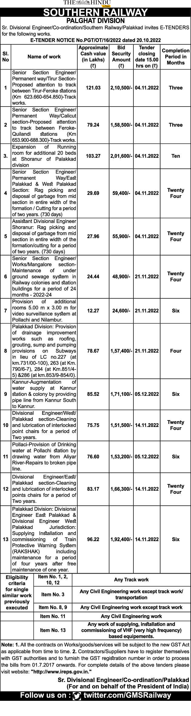 Senior Section Engineer/Permanent way/Tirur Section-Proposed attention to track between Tirur-Feroke stations (Km 623.660-654.850)-Track works.