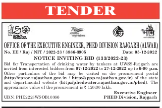 Tender for Transportation of drinking water by tankers at UWSS-Rajgarh