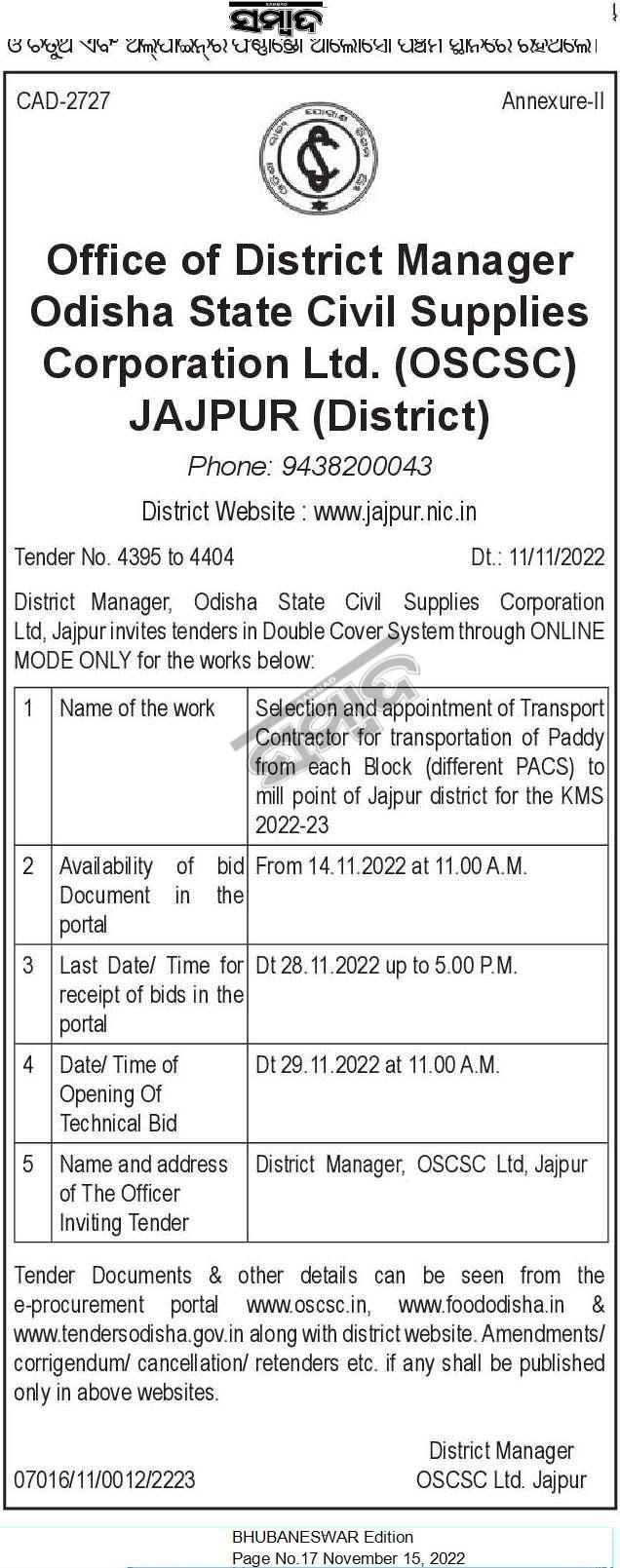 Selection and appointment of Transport Contractor for transportation of Paddy from each Block (different PACS) to mill point of Jajpur district for the KMS 2022-23