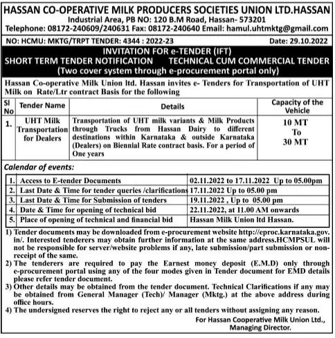 Tender for Transportation of UHT milk variants & Milk Products through Trucks from Hassan Dairy to different. destinations within Karnataka & outside Karnataka (Dealers) on Biennial Rate contract basis. For a period of One years