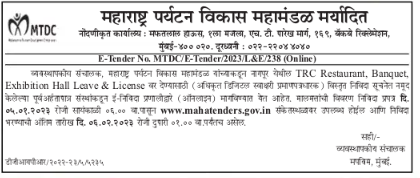 Tender for TRC Restaurant, Banquet, Nagpur from Managing Director, Maharashtra Tourism Development Corporation | (Authorized digital signature certificate holders) are invited through e-tender system (online) from the pre-eligible organizations mentioned in the detailed tender notice for issue of Exhibition Hall Leave & License.