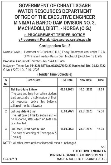 Tender for Treatment of 3 Bucket (E.D.A.) Epoxy Treatment work under E.R.M. of Minimata (Hasdeo) Bango Dam Machadoli (Block No 19 to 26)