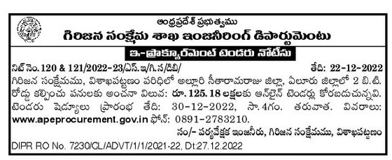 Tender for Tribal Welfare, Alluri Seetharamaraju District under Visakhapatnam, 2 BT in Eluru District. Estimated value of road construction works