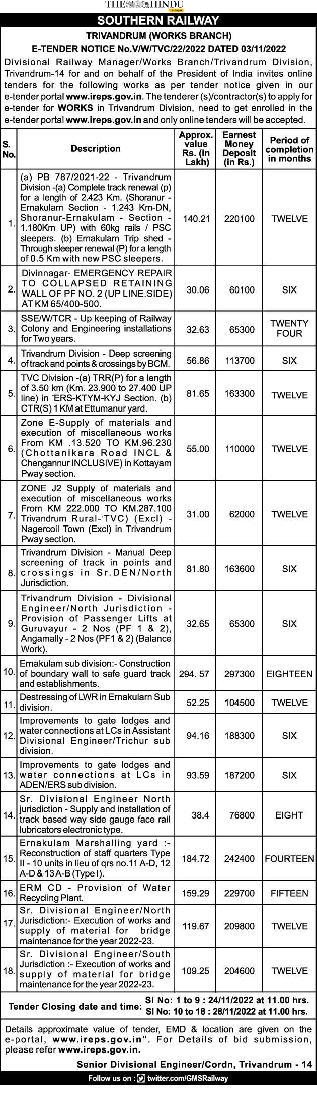 Tender for Trivandrum Division Divisional – Engineer/North Jurisdiction Provision of Passenger Lifts at Guruvayur 2 Nos (PF 1 & 2), Angamally-2 Nos (PF1 & 2) (Balance Work).