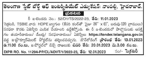 Tender for TSBIE intends to select an agency for supply of HDPE bags (size 26″x 41″, weight 120 grams in saffron colour).