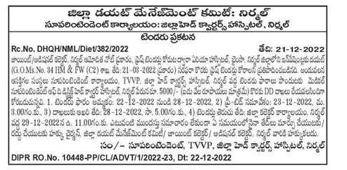 tenders as per approved note of Joint/Additional Collector, Nirmal. It is proposed to call for tenders. Therefore interested organizations can obtain tender forms from the Office of the Superintendent, TVVP, District Headquarters Hospital, Nirmal in the name of Medical Superintendent of the District Headquarters Hospital,