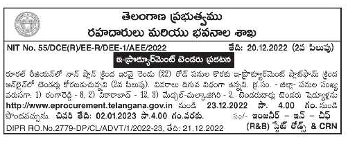 Tender for twenty two (22) road works under non-plan in rural region (2nd call). Details are as below. Cr. No. – District-Number of works, respectively: 1)Rangareddy – 8, 2) Vikarabad – 12, 3) Medchal-Malkajigiri – 2,
