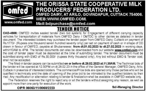 (two bid system) for Engagement of different carrying capacity vehicles for transportation of materials from OMFED Dairy/ OMTDC