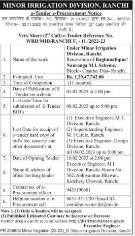 Tender for Under Minor Irrigation Division, Ranchi. Renovation of Raghunathpur/ Nauranga M.I. Scheme, Block:- Chanho, Dist- Ranchi.