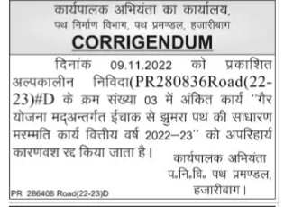 Tender for Under plan head Ichak to Jhumra road simple | Repair work for financial year 2022-23 unavoidable | Canceled due to reason is done. Executive Engineer P.N.V. Road Division, Hazaribagh | |PR 286408 Road (22-23)D