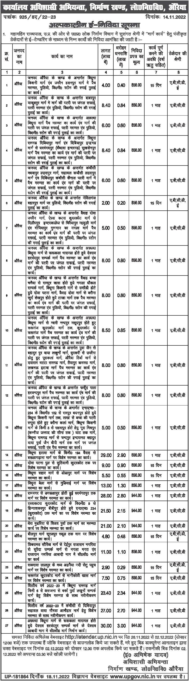 Tender for Under the block of district Auraiya, Puva Jain to Bahadurpur via Lakhoon road, Dhupkari to Uparanga Hotu Purakalan road, Auraiya Tirwa road to Dayaram Bhatta Ramgarh road, Taiyapur Kanmau road, Lucknow Etawah road, patch repair work and cleaning of forest on the track. , track repair and culverts, km stone painting work