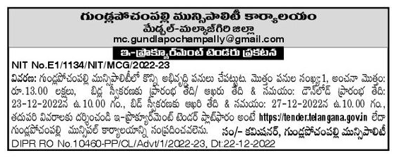 Tender for Undertaking some development works in Gundlapochampally Municipality. Total Number of Works 1.