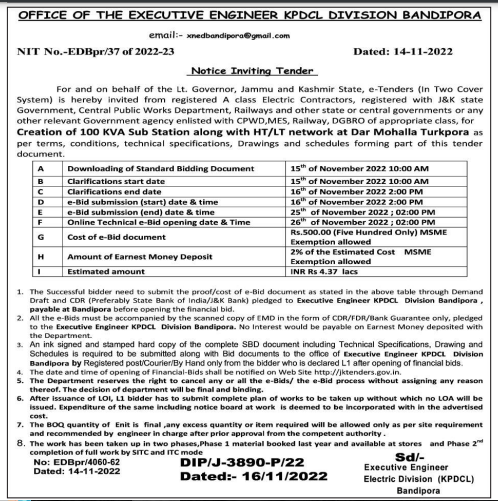 Creation of 100 KVA Sub Station along with HT/LT network at Dar Mohalla Turkpora